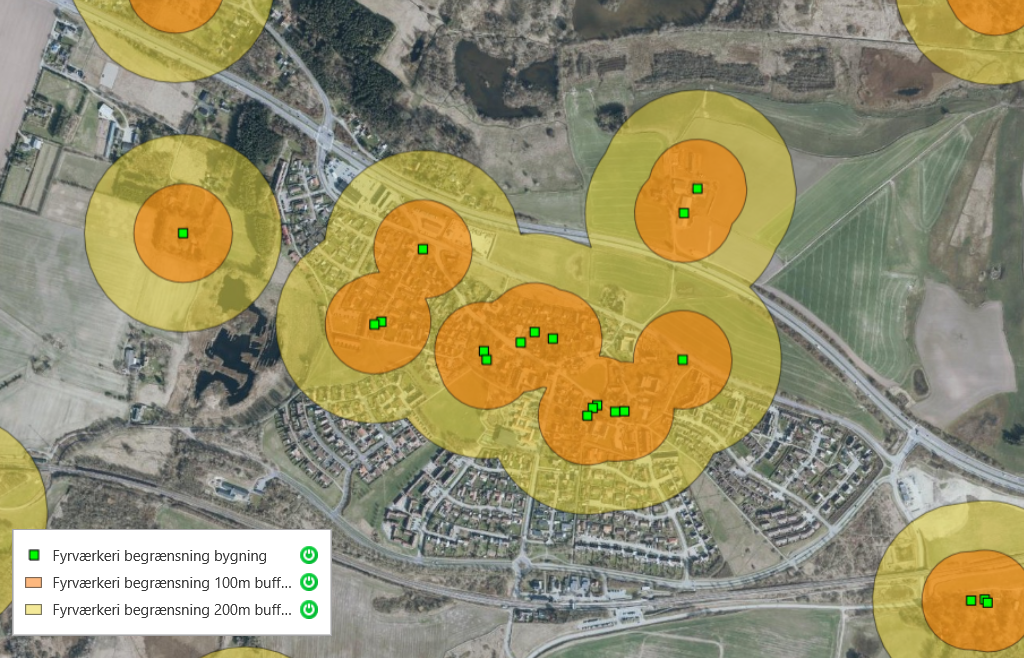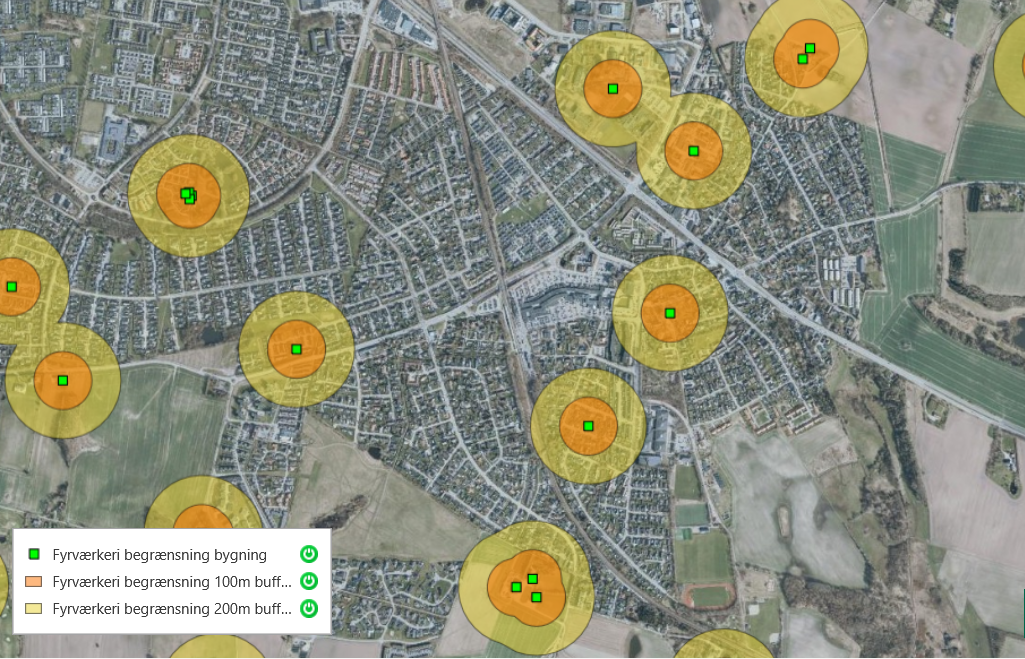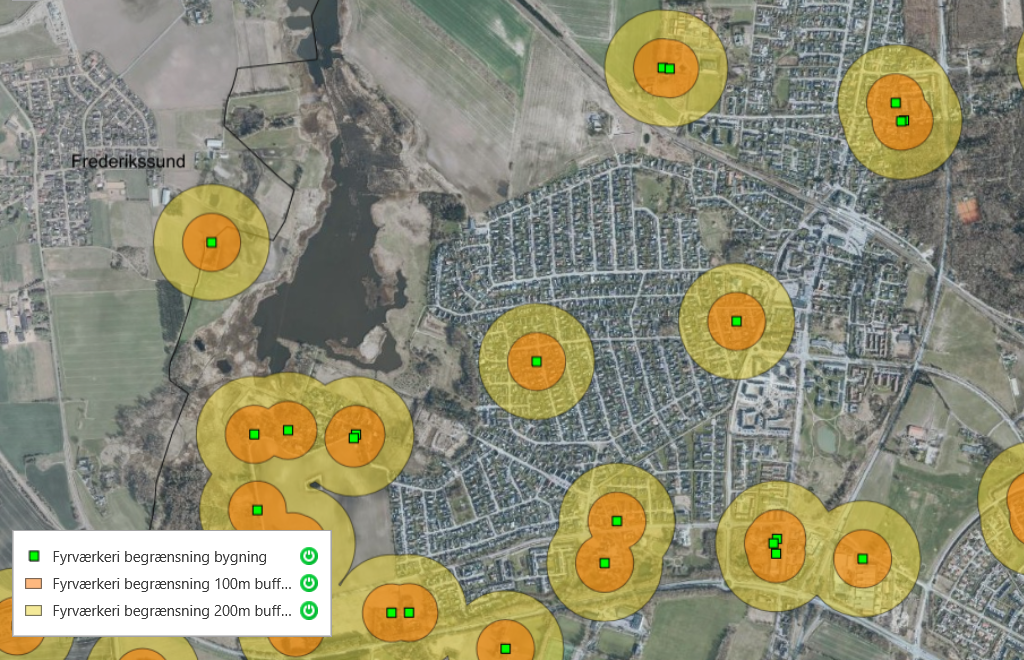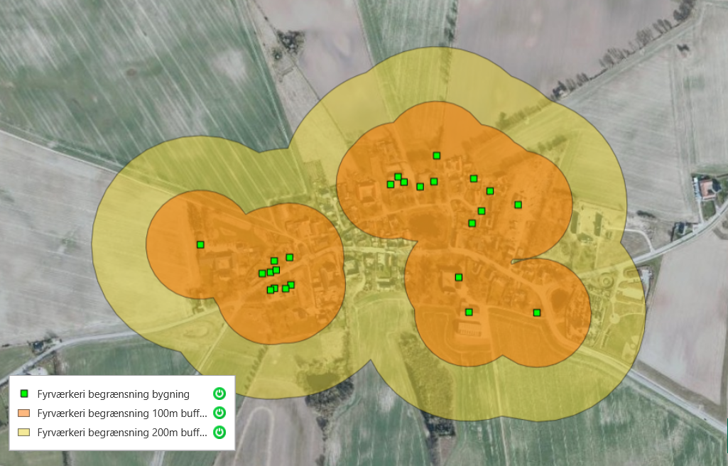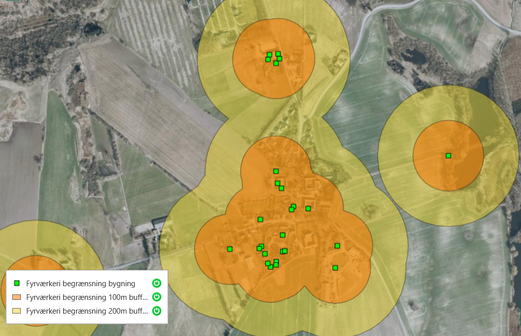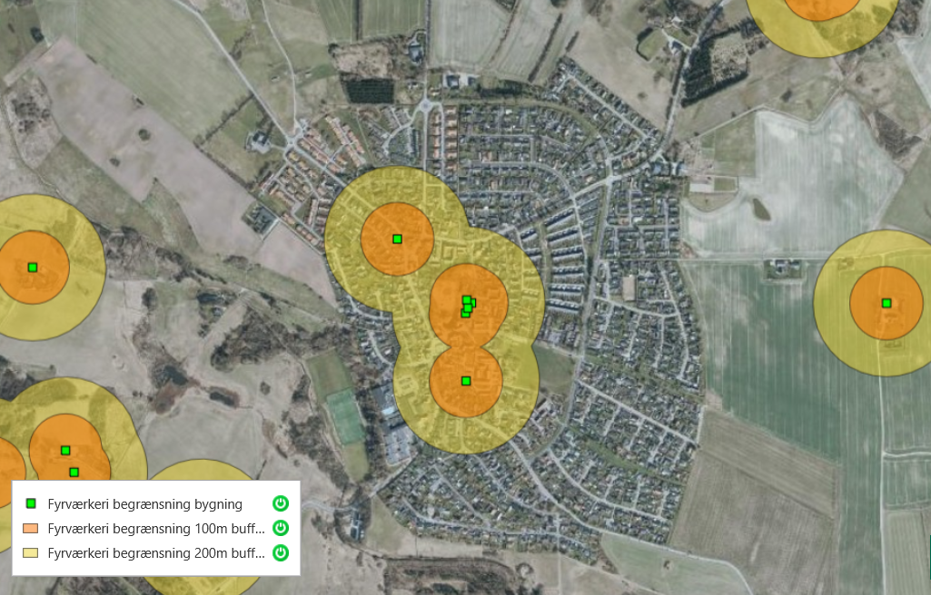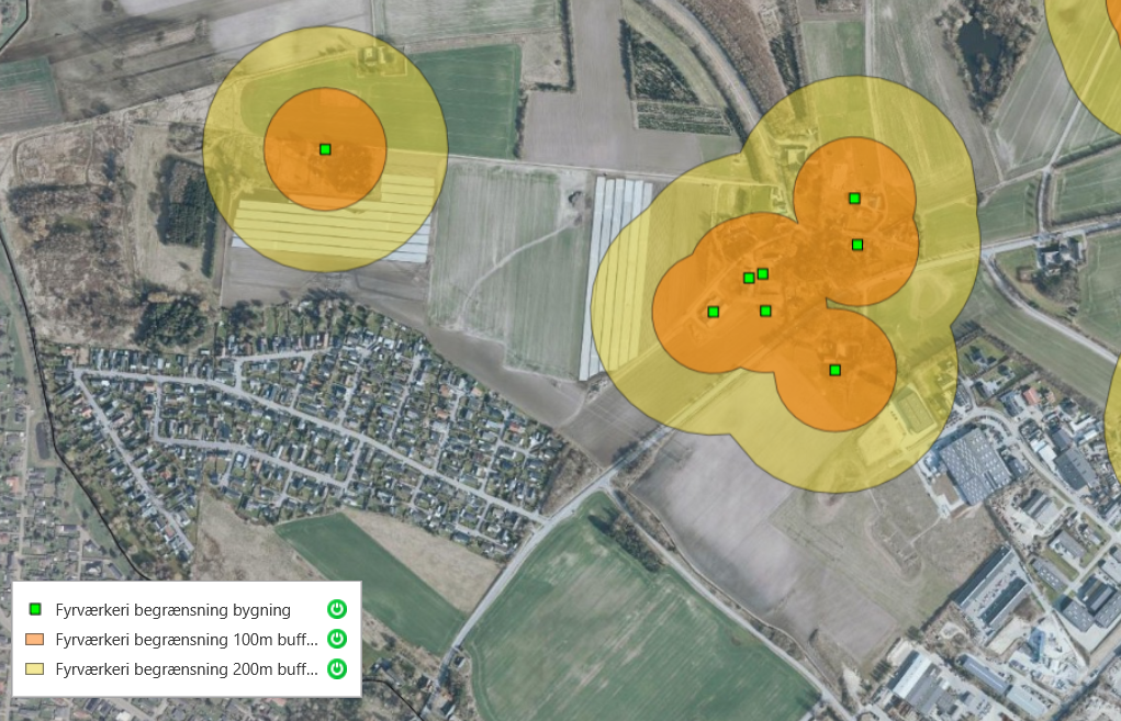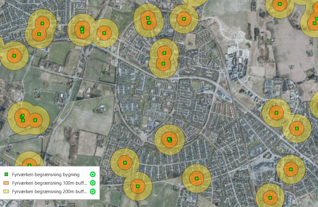 De grønne felter angiver ejendomme med letantændeligt tag. Inden for de gule felter må du ikke affyre raketter. Inden for de orange felter må du heller ikke afskyde batterier og andet jordfyrværkeri: