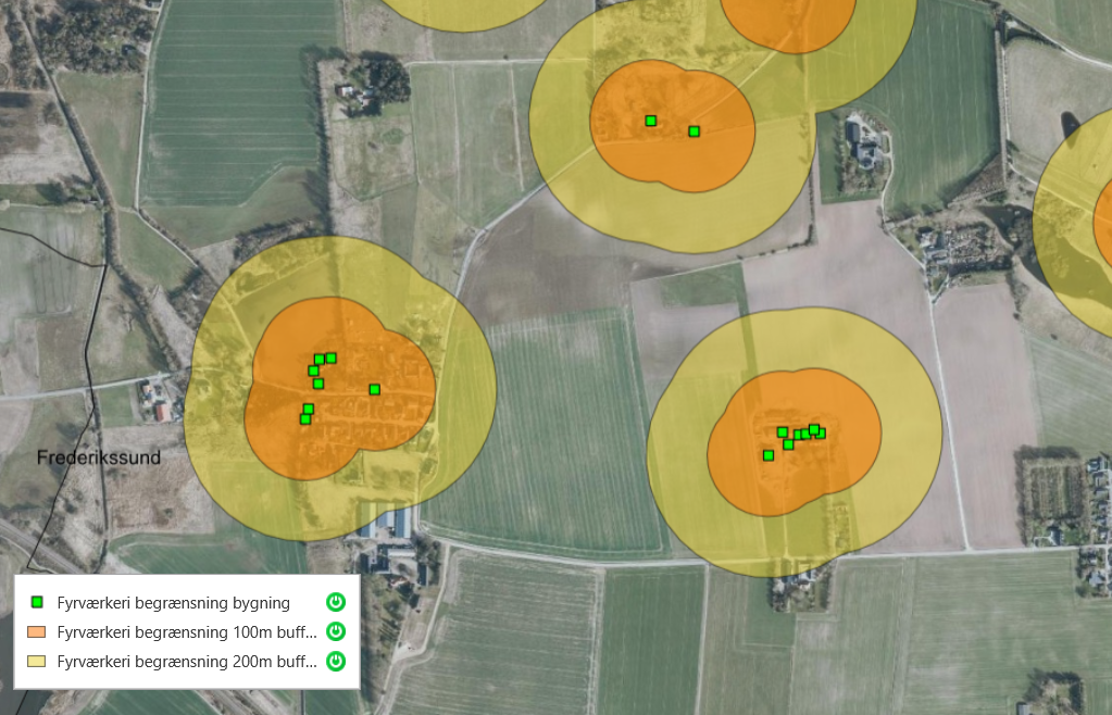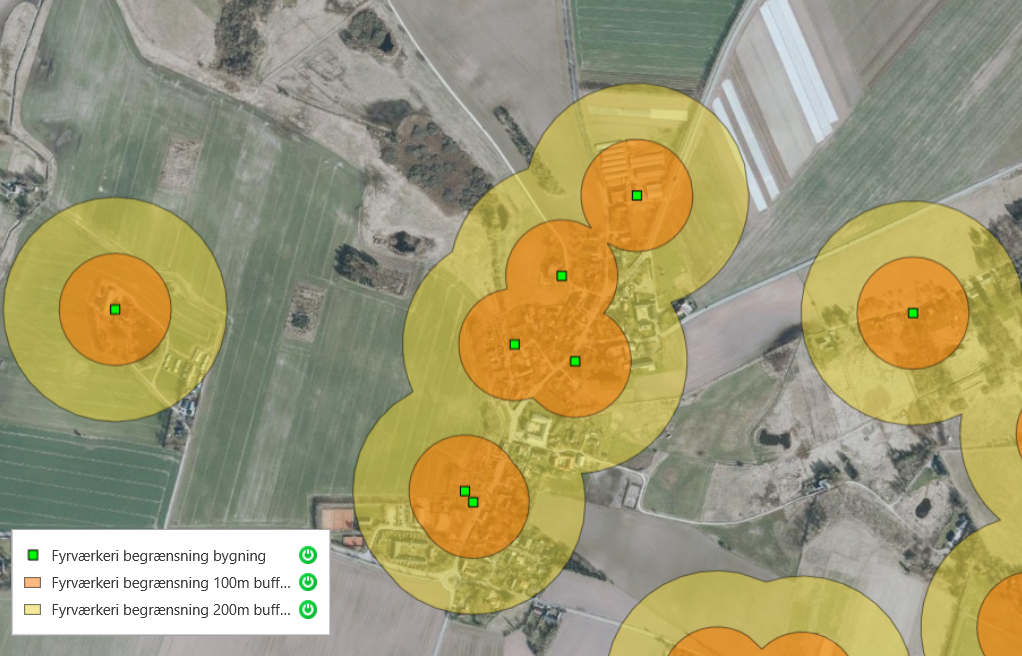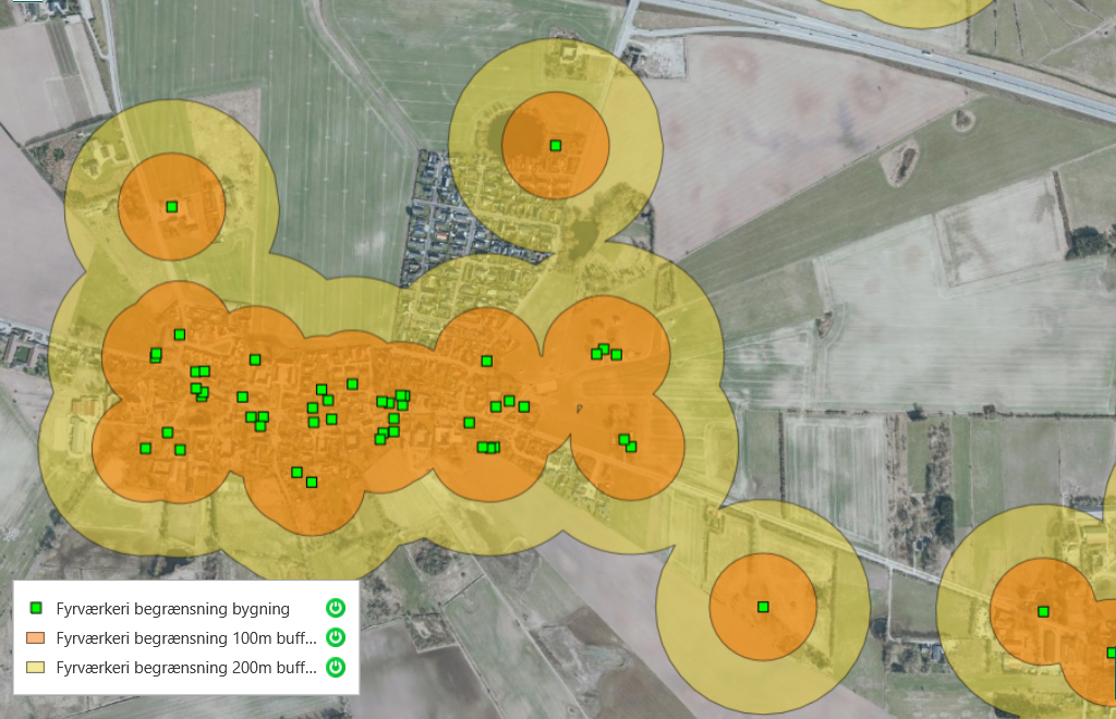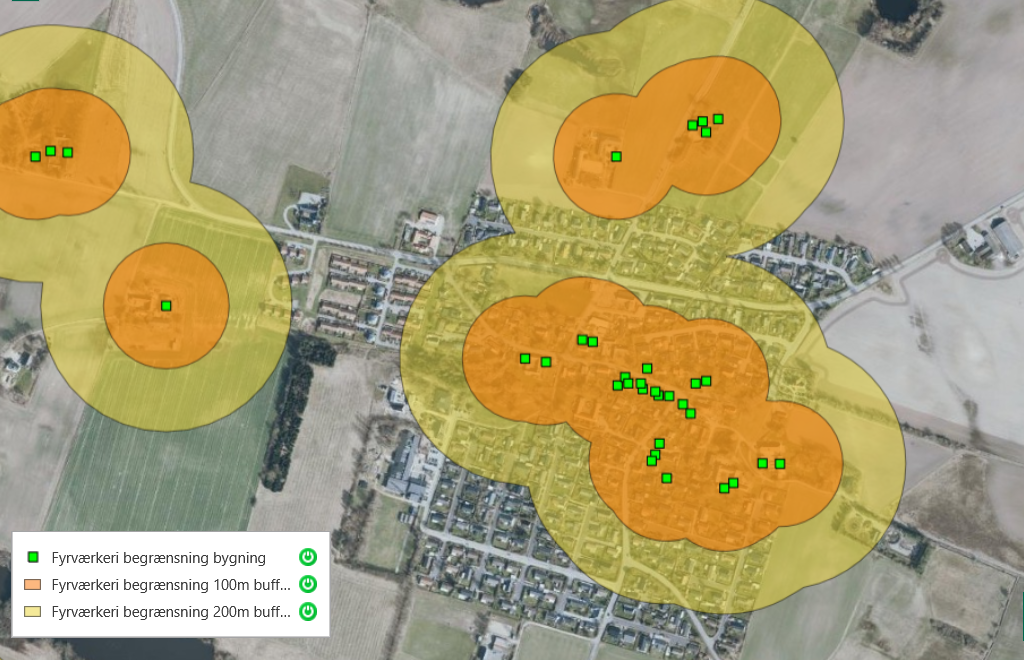 For de populære batterier og andet fyrværkeri, der bliver på jorden, er kravene lidt mindre restriktive, men stadig vigtige. Her skal du sørge for en afstand på mindst 100 meter til huse med stråtag. Det er den zone, der er indtegnet med orange på kortene herunder.